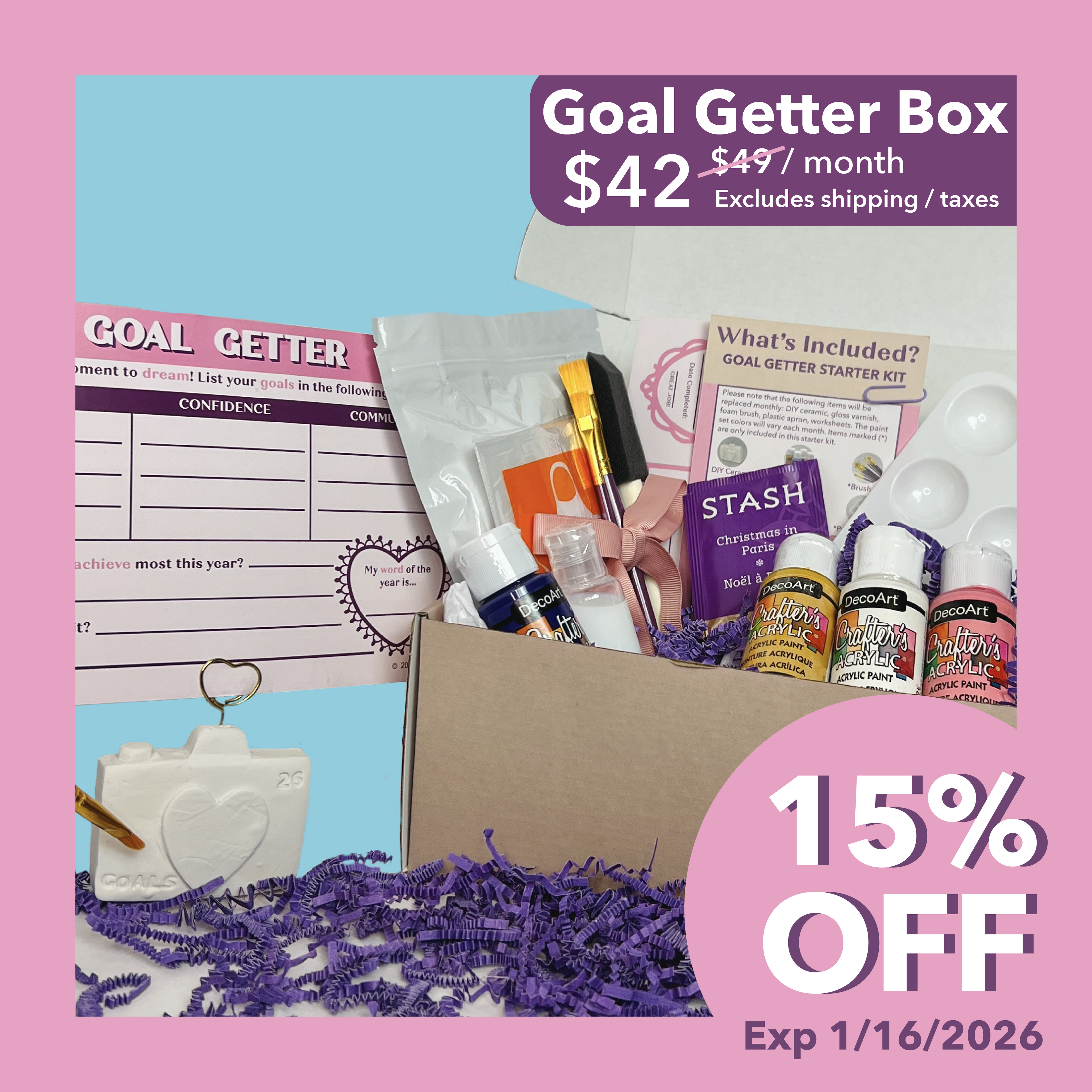 SIGN UP- This one time enrollment is the beginning of your monthly Goal Getter Box journey. Enroll before the 15th of the month. Curated boxes will be mailed by the 22nd of each month. Subscription box orders received after the 15th will be shipped the next month.