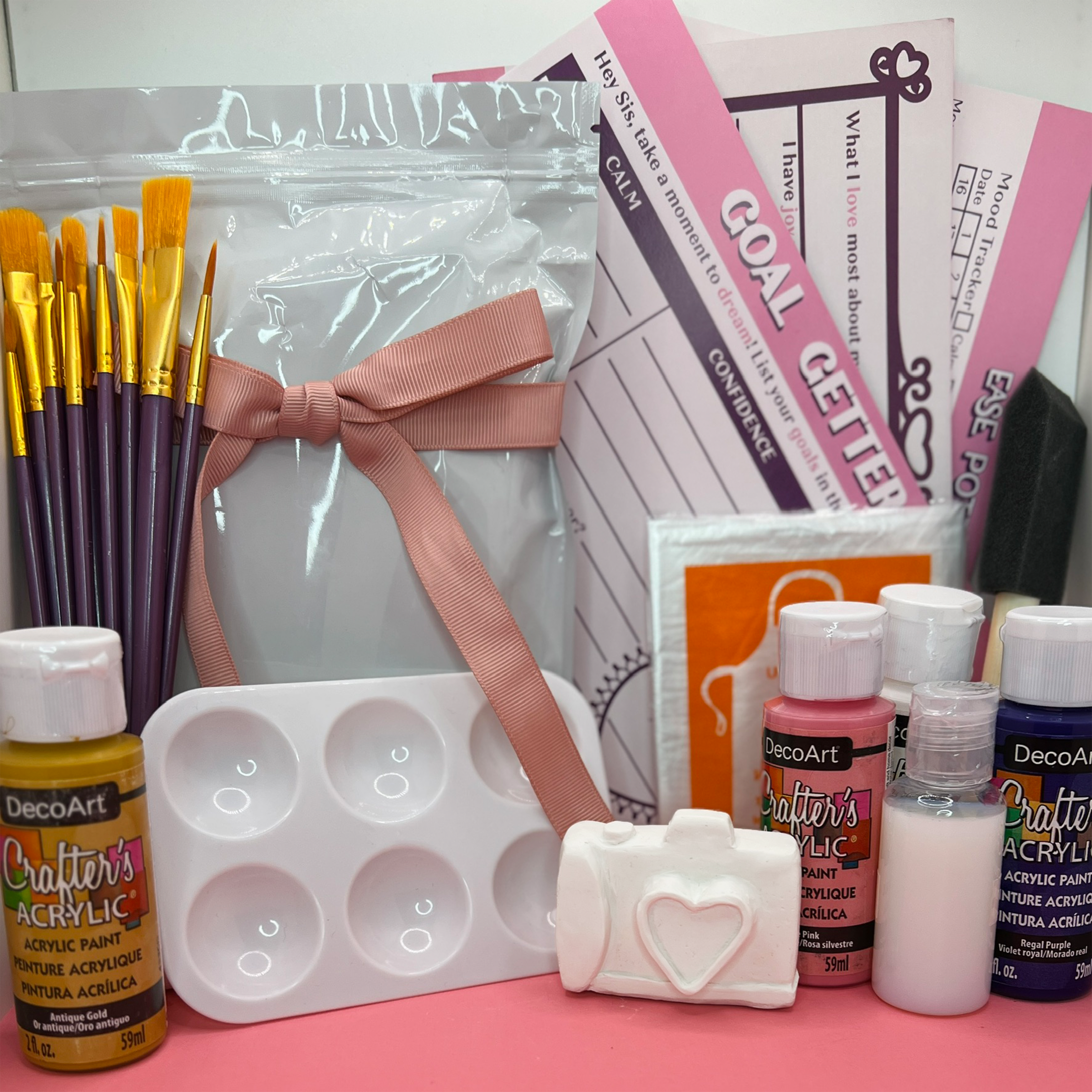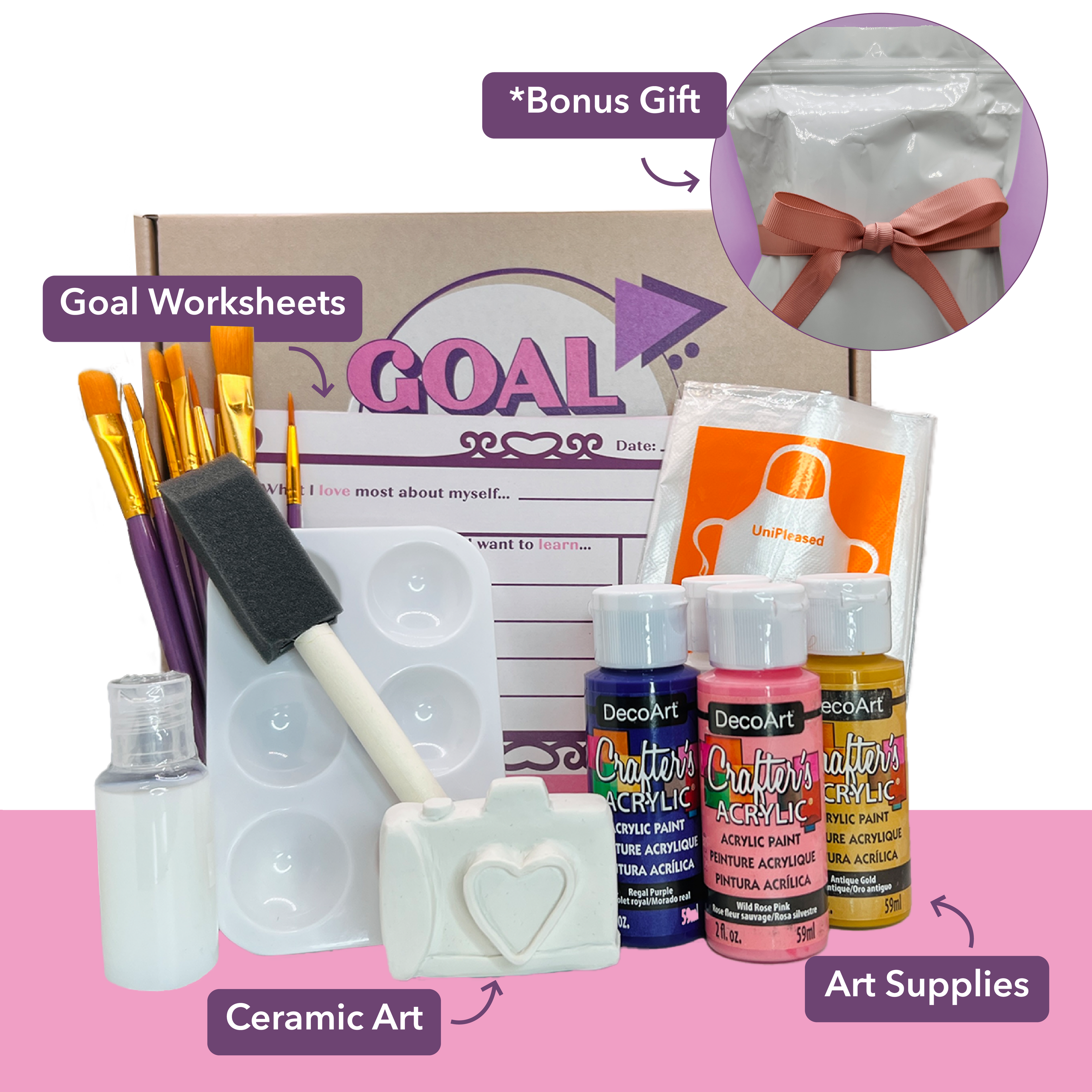 At Ease Pottery we’ve created a safe space for women to paint pottery, pursue their purpose, and build community. Each month the Goal Getter Box is filled with art supplies and planning resources to promote taking actionable steps toward your goals.